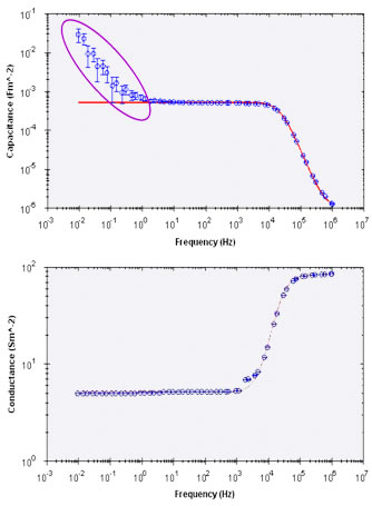 - At frequencies <1 Hz the capacitance increases dramatically with decreasing frequency (shown encircled). This is due to the diffusion polarisation impedance elements. While the phase angle in this regime is very small, the capacitance, as a function of frequency can still be determined (see diagram) by the INPHAZE spectrometer because of its very high phase resolution of 0.001 degrees, and this allows characterization of the diffusion polarisation effects.